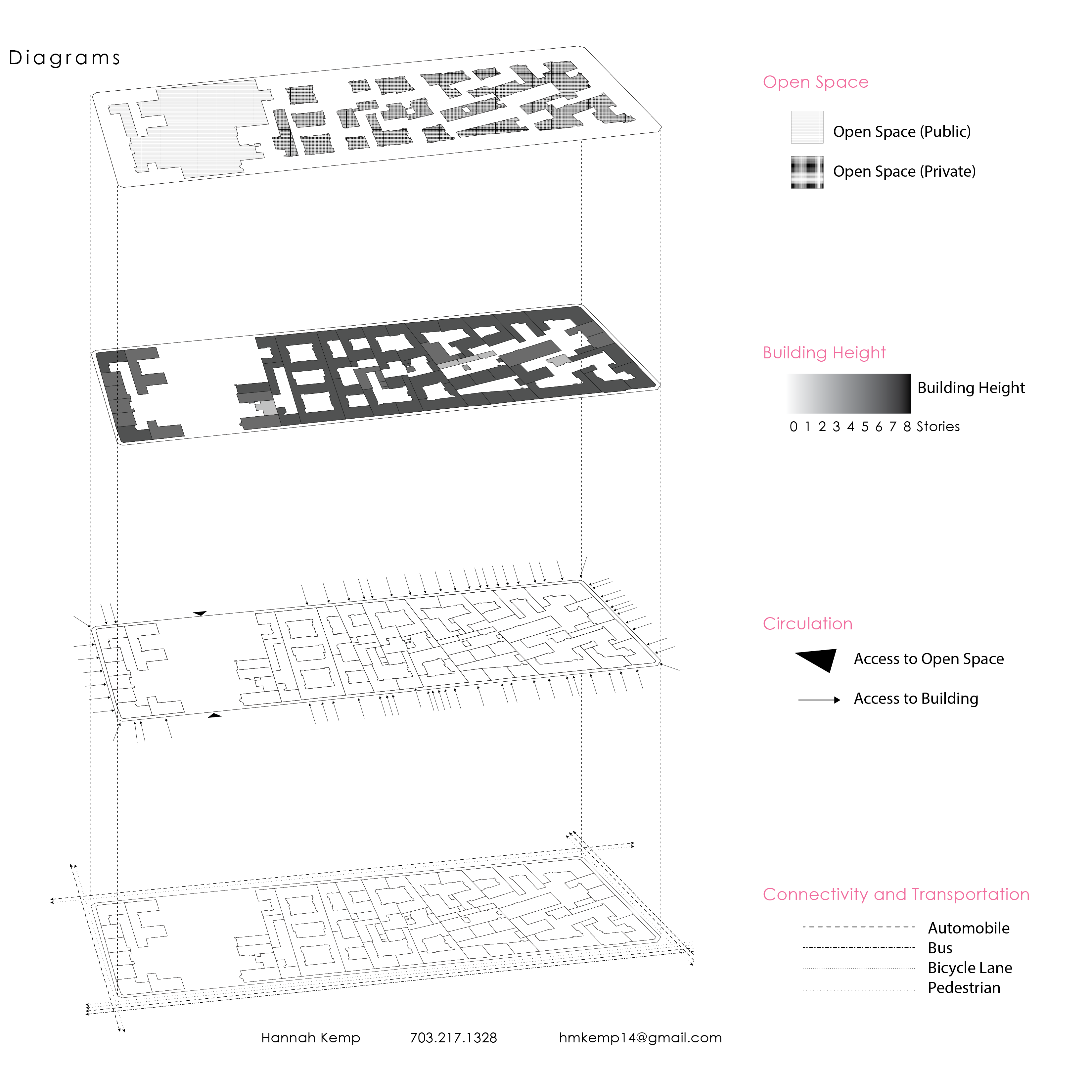 Diagrammatic drawings evaluate open space, building height, circulation and multimodal transportation to identify key characteristics of the block typology. Technical drawings reveal a block typology that is comprised of a diverse mix of residential, office, commercial, and institutional spaces, with predominantly six-story buildings and mid-block courtyards that can serve as public space. This block typology identifies characteristics that define the unique urban fabric of Prenzlauer Berg, Berlin.